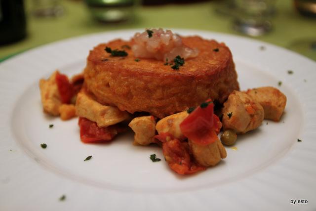 Riso Carnaroli al salto mantecato con zafferano, ripieno di calamari, gamberi, cozze, lupini, pollo, salsiccia e piselli.