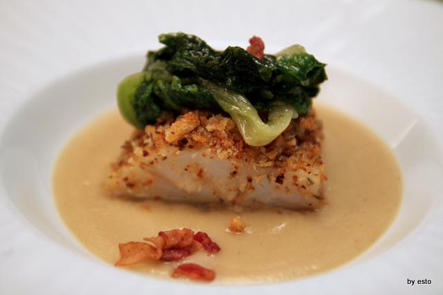 Baccalà in crosta di pane al rosmarino, su crema di cicerchie, scarola e pancetta.
