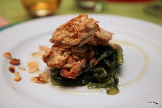 Pollo alle mandorle di Noto con salsa al limone di Sorrento e cicorie ripassate.