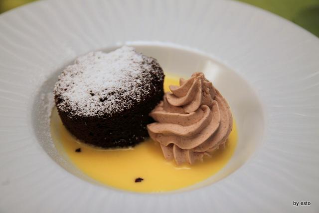 Pancake morbido al cacao con semifreddo di castagna e zabaglione alla vaniglia.