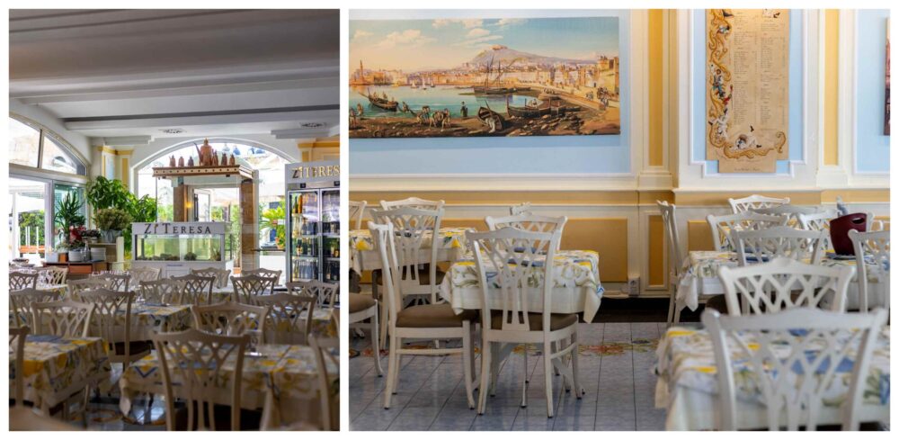 Questo è anche uno dei motivi per cui Zi Teresa è molto amato dai turisti: si trova in una posizione privilegiata, proprio di fronte al Castel dell’Ovo. Pranzare o cenare qui significa godere dello spettacolo delle barche ormeggiate, della brezza marina che accarezza d’estate e dell’atmosfera intima e suggestiva che si respira anche d’inverno, quando attraverso le ampie vetrate si può continuare a gustare il mare.