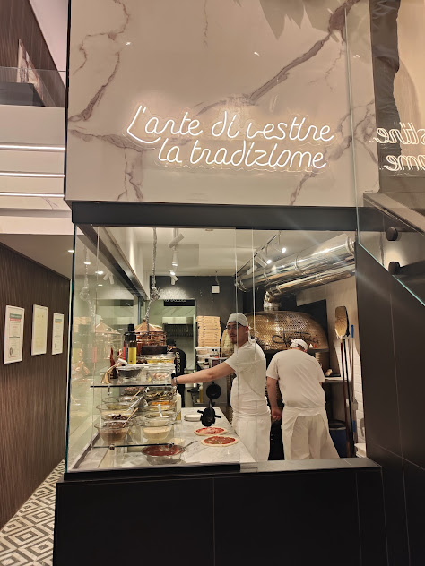 Delle pizzerie di una volta ha conservato, ma reso ovviamente al passo con i tempi, il forno a vista all’ingresso, poi c’è la sala su via Giotto con un bancone cocktail bar e il piano superiore con altre sedute.