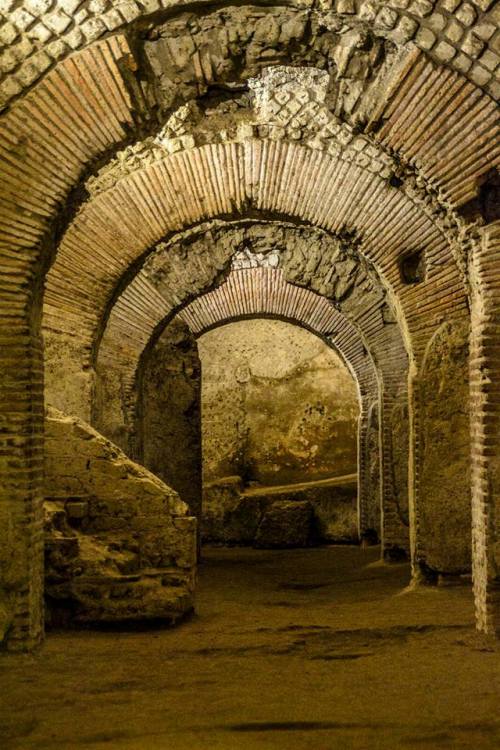 Considerato il fatto che in questa parte dell’attuale città ci sia una notevole concentrazione di pizzerie, molte delle quali appartenenti a famiglie storiche, ci piace pensare che la pizza napoletana sia nata qui. In effetti la pizza ha preso forma dalle mani di panificatori che hanno pensato di “ammaccarla” e condirla con pochi elementi, qui disponibili in grandi quantità, per ottenere un pasto povero e completo. Le Tabernae che danno verso sud si uniscono al criptoporticum, il macellum, attraverso un lungo corridoio ad archi laterizi, suddiviso in piccoli ambienti comunicanti, alcuni dei quali dotati di banco inclinato in muratura, con foro al centro, sui quali era esposta la merce.