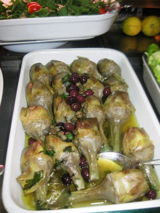 peperoni in padella, melanzane a funghetti, carciofi alla giudea, cavolo e olive in insalata, che oggi quasi più nessuno prepara a casa per due ragioni opposte: chi lo adora dice che non si trovano i cavoli con l’odore ‘e ‘na vota; chi non lo ama dice che puzza. :-)