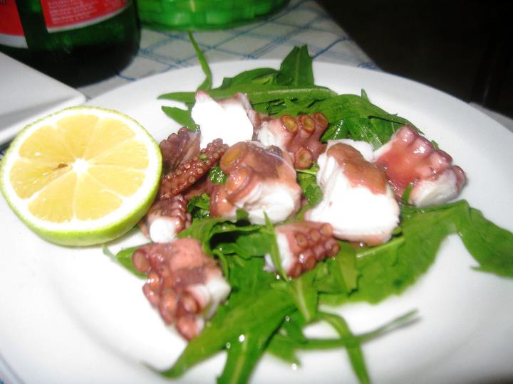 il polpo all’insalata, marinato in olio, sale, pepe, e limone e servito con spicchio di limone a parte per chi ne gradisce ancora