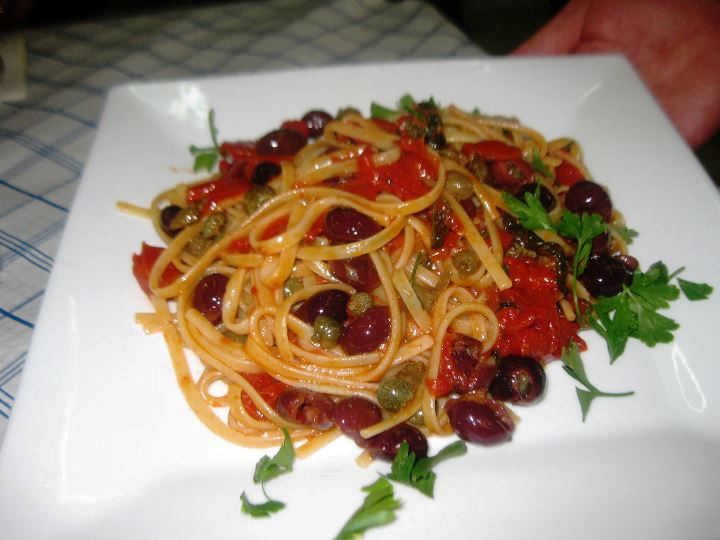 Ci avviciniamo al momento topico, le 14,00, l’ora classica dello “spacco” in città ed ecco altri due primi, uno di mare, spaghetti con misto di calamari, seppioline e cozze e l’altro di terra, un’invitante linguina alla puttanesca, entrambe preparate con l’amore e gli accorgimenti di chi sta cucinando per la propria famiglia, in questo caso decisamente molto allargata :-)