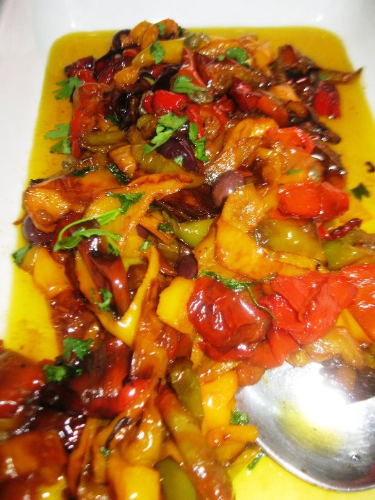 peperoni in padella alla napoletana, ben conditi, aglio, olio, olive e capperi, perfetti per farcire le “marenne”