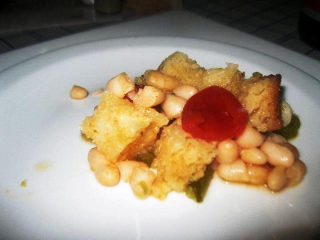 Arrivano a tavola gli assaggi di antipasti: polpo verace all’insalata, calloso al punto giusto, zuppetta di fagioli cannellini con tocchetti di pane, sedano, pomodorini e olio a crudo e poi una porzione di succulenta provola di Agerola.