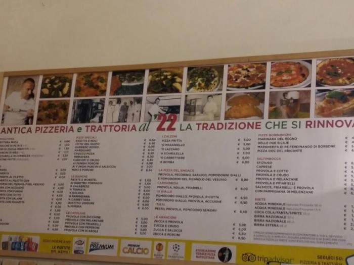 Al 22 di Giovanni Improta è da sempre un riferimento assoluto per gli appassionati. Lo schema è quello della trattoria-pizzeria, ossia ci sono piatti cucinati tipici della tradizione, lardiata e genovese, ma anche spaghetti con le vongole, e, naturalmente la pizza. Come quasi tutto a Napoli, bisogna fare la fila, soprattutto nei giorni di festa. I prezzi sono popolari e difficilmente spenderete più di 25 euro a testa.