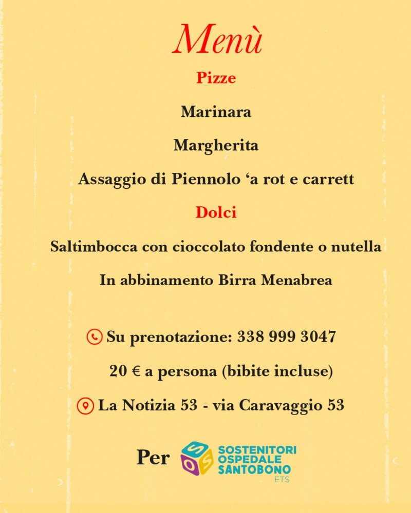 Una serata a base di pizza, famiglia, identità e solidarietà a favore di Sos Sostenitori Ospedale Santobono Ets. Locandine, post descrittivi, storie sui social, video promozionali e claim accattivanti stanno girando tantissimo sul web con la locandina e i dettagli dell’appuntamento “pop”. Lunedì 9 febbraio alle ore 20 è in programma un evento speciale alla Pizzaria La Notizia 53 (Via Caravaggio, 53 Napoli).