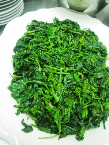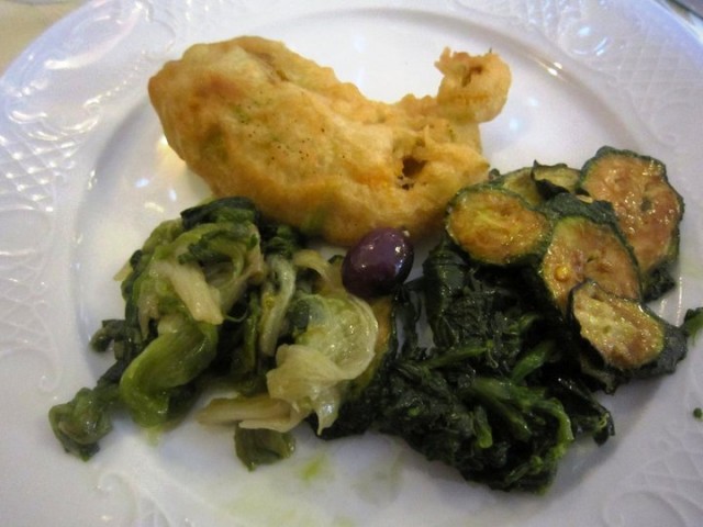 melanzane a scarpone, scarole affogate con olive nere, passi e pinoli, immancabili i friarielli, verdissimi e croccanti.