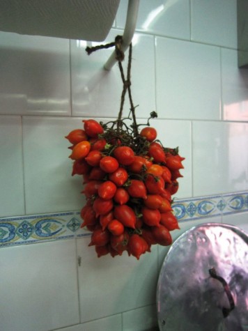 In primavera – estate tante verdure lesse, carote fagiolini, carote rosse, patate, le primizie di asparagi e carciofi in tutti i modi: indorati e fritti, le “mammarelle” (grossi carciofi da lessare e gustare, foglia a foglia con una grande olio di qualità), ancora carciofi ripieni al forno con mozzarella e salame, oppure olive e capperi con peperoncino, o alla giudea. D’estate arrivano le mitiche polpette di melanzane di Maria, quelle che i clienti vengono a rubare in cucina, una dietro l’altra, tipo ciliegie; preparate con uova battute, pane raffermo, polpa delle melanzane, salame, provola e basilico. Il pomodorino del piennolo è una costante della cucina di Maria. Ci deve essere, infatti, giù in cantina al momento dell’acquisto in quantità notevoli, la volta a cupola diventa uno spettacolare trionfo rosso pomodoro. Anche per i dolci si rispetta la stagione: la pastiera si fa a Pasqua ribadisce Maria,