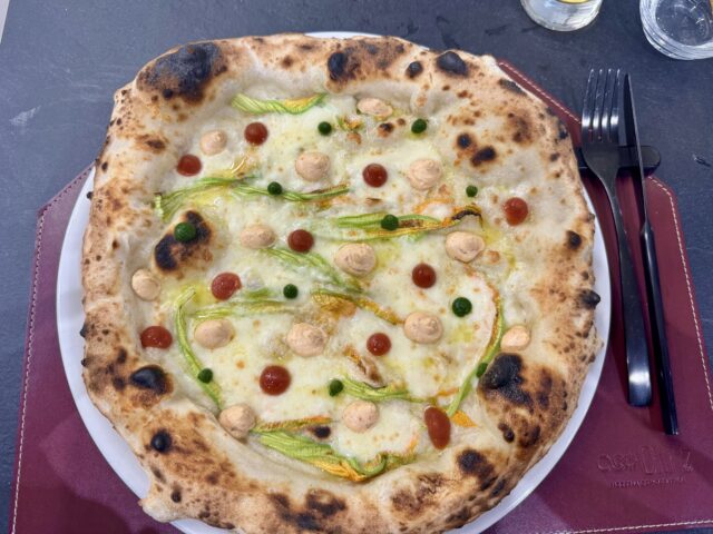 Tra le pizze più richieste spiccano la Margherita, simbolo intramontabile della tradizione partenopea, che ho provato in doppia cottura (8,5€), e la Carbonara, una rivisitazione ispirata al celebre piatto di pasta romana. Tra le speciali, suggerisco Oltre I Mari, una visione personale della classica marinara, servita con pomodoro san Marzano infornato, pomodorino datterino bruciato, aglio al latte, origano e alici (11€), e la Fior Dipinto con fiori di zucca, fior di latte, chutney di pomodoro, salsa al basilico e ricotta aromatizzata ai capperi (12€).