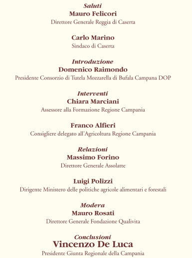 L’assemblea annuale sarà conclusa dall’intervento del presidente della Regione Campania, Vincenzo De Luca. Ai lavori parteciperanno l’assessore regionale alla Formazione Chiara Marciani; il consigliere delegato all’Agricoltura Franco Alfieri; il dirigente del ministero delle Politiche agricole Luigi Polizzi; il direttore di Assolatte Massimo Forino. Porteranno il loro saluto il direttore della Reggia di Caserta Mauro Felicori e il sindaco della città Carlo Marino. La relazione introduttiva sarà tenuta dal presidente del Consorzio di Tutela, Domenico Raimondo.