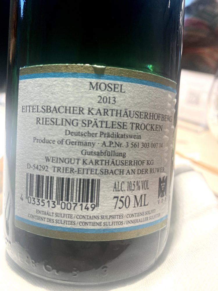 Si segue il tracciato della freschezza con un Riesling dal nome che pare uno scioglilingua: Eitelsbacher Karthauserhofberg Spatlese Trocken di Karthauserhof (Palatinato), millesimo 2013.