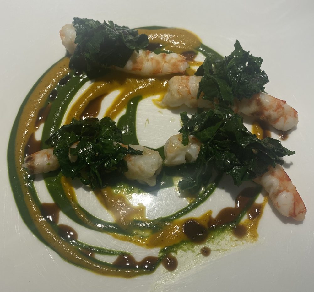 Nel calice, però, appare subito in forma smagliante, ancora dorato e addirittura verdolino sui bordi. E’ marino e fumoso, abbastanza timido sulle prime, con qualche cenno di lanolina e cera d’api, un tocco di cotognata. Molto snello, ancora dritto, verticale, fa il suo dovere su di un piatto pienamente stagionale: mazzancolle alla brace, senape selvatica, zucca alla brace. L’immagine resa dall’accoppiata è quella delle tante colline che si attraversano percorrendo l’A14: distese di macchia imbrunita che digradano verso l’azzurro immenso del mare.