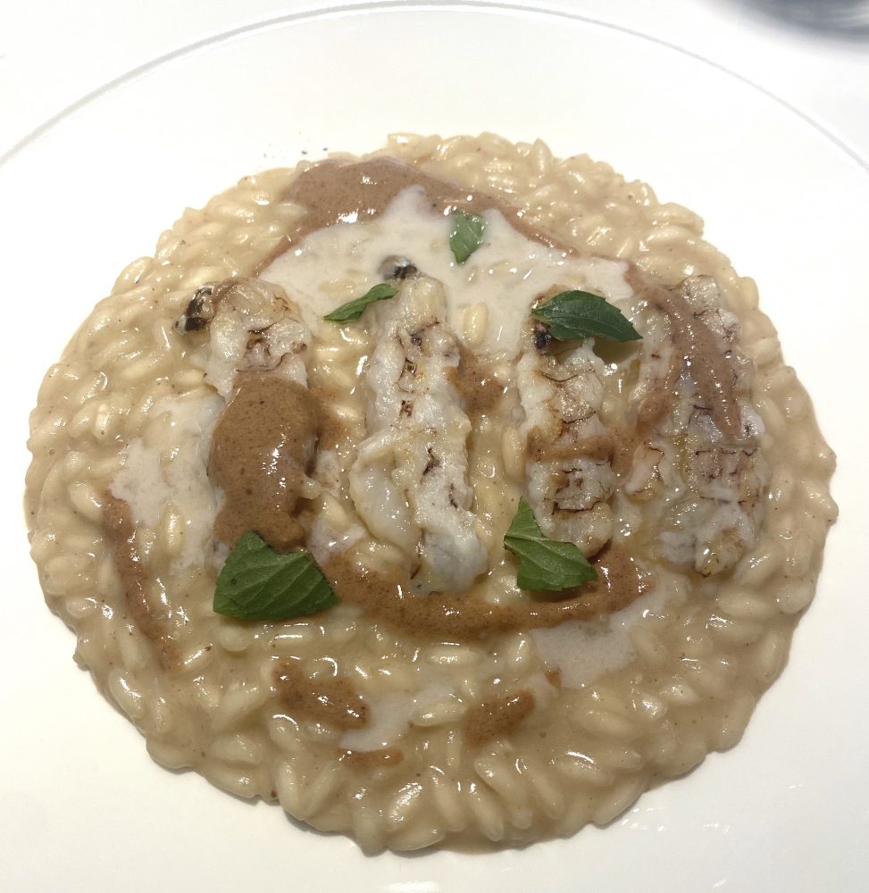 Ed è così che, ad accoglierci, troviamo il gessoso, balsamico Champagne Sagacitè di Alain Mercier, vigneron a Passy-sur-Marne, in abbinamento a un’apertura del percorso che, al netto di svariate visite negli ultimi anni e altrettante variazioni, rientra tra le mie preferite in assoluto : partenza “verde” con melone aromatizzato al San Pasquale, amaro prodotto ad Atessa (Chieti) che di solito viene servito a fine pasto come idraulico liquido; passaggio per la Costa dei Trabocchi con il bignè allo sgombro, per poi approdare nell’entroterra con la polenta all’aglio nero di Sulmona e un arancino ripieno di ventricina.