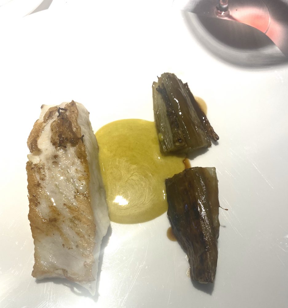 Sempre il Nuits sul rombo chiodato, bernese e alle acciuge e cardo alla brace, a dimostrare – semmai ce ne fosse bisogno – che rosso e pesce possono andare d’accordo, a patto che il rosso non sia troppo tannico e il pesce piuttosto saporito. Il cardo è un omaggio alla tradizione natalizia abruzzese: di solito lo si spezzetta nel brodo, qui invece dà la terza dimensione al rombo con il solito elemento vegetale rinfrescante e un tocco fumè.