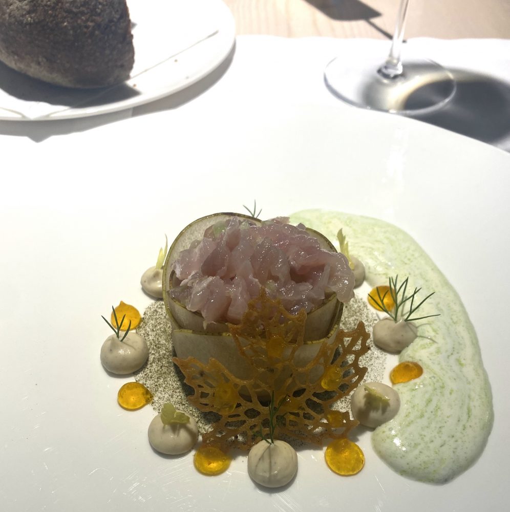 Sa di pere e mostarda di pere – oltre che di erbe officinali e idrocarburo – e va a completare un piatto in cui le pere giocano un ruolo fondamentale, bilanciando ed arricchendo la tartare di ricciola, mentre il kefir – liquido a base di latte fermentato tipico della parte asiatica dell’ex U.R.S.S – dà la spinta acida e rende il tutto più nordico.