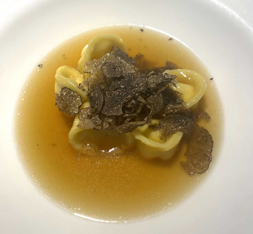 Stesso vino sul risotto, noci, cicale di mare e tè verde, che gioca di nuovo sul contrasto salmastro-vegetale-terragno. Poi, con “il piatto di natale”, tortelli di ripieni di Pecorino di Farindola in brodo di cappone con tartufo nero, si va in Borgogna per un Nuits Saint Georges di strabiliante finezza aromatica. Aux Saint-Juliens 2017 di De Montille proviene dalla parte del comune più vicina a Vosne-Romaneè, la mecca mondiale del Pinot Nero, e, in effetti, ha un naso in pieno stile Vosne su toni d’incenso e coriandolo, acqua di rose, gelatina di ribes e ginseng. Non ha la densità, la concentrazione di un Premier Cru o di un Grand Cru, ma la stratificazione di profuma è da fuoriclasse. Questa volta con l’abbinamento si fa un bel salto: dalle atmosferiche appenniniche del piatto ai ricordi di bazar mediorientale che prendono vita nel calice.