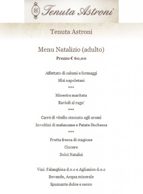 Il secondo ristorante scelto è a Napoli, per la precisione ad Agnano, e pochi napoletani non ci sono stati almeno una volta in occasione di battesimi, matrimoni o cresime. Si tratta della Tenuta Astroni, a due passi dalla riserva omonima e dall’autostrada. Il locale si presenta bene, certo più adatto a un matrimonio che a un pranzo romantico, credo infatti che sia adibito solo ad eventi e non a semplice ristorante. Il prezzo, adeguato al luogo, è di 60 euro ma c’è un menù bambini (interamente diverso, con prosciutto/mozzarella, gnocchetti e cotoletta a 30 euro).