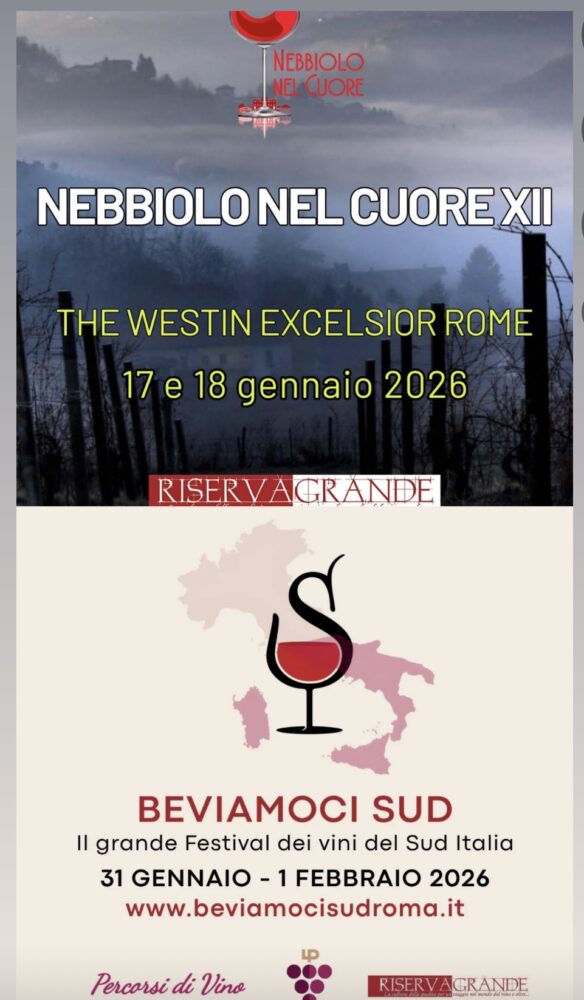 Nebbiolo nel Cuore si svolgerà sabato 17 e domenica 18 gennaio 2026 negli eleganti saloni del Westin Excelsior di via Veneto a Roma mentre Beviamoci Sud vi aspetta il 31 gennaio e il 1 febbraio sempre al Grand Hotel Excelsior.