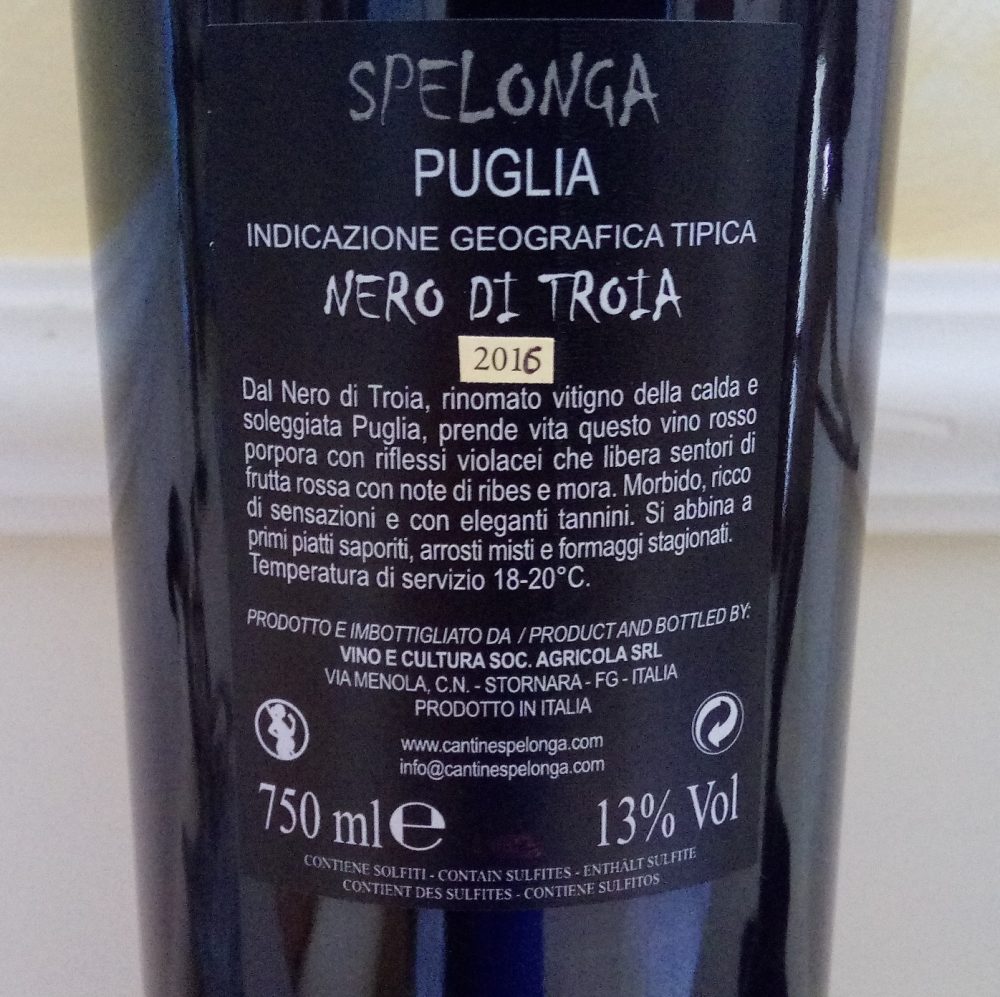 Controetichetta Nero di Troia Puglia Igp 2016 Spelonga