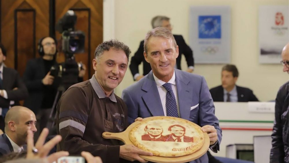 Marco Amoriello con la pizza dedicata a Roberto Mancini