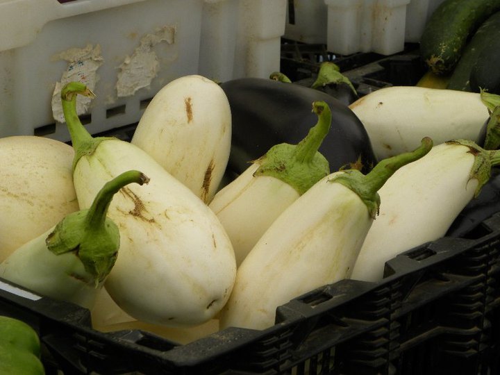 Ancora rapita dai colori dei frutti di stagione mi domando dove sia il colore di fronte alle melanzane bianche. Chiedo una ricetta e rimango impressionata dalla cultura gastronomica di quest’uomo che sarebbe un contadino, ma sembra invece un tuttologo. Mi spiega, riguardo le melanzane, che hanno la buccia più tenera e meno semi. Si prodiga generoso in ricette dettagliate di curry indiani e moussaka passando per la parmigiana e conoscendo addirittura la variante con l’uovo e senza. “ Guarda che i nuovi contadini, quelli veri, quelli consapevoli,siamo noi” dice M., ex ingegnere edile, che rifiuta fermamente di essere fotografato. “Noi” continua “come molte delle persone che sono qui oggi abbiamo compreso che siamo parte della soluzione della crisi del cibo e che mangiare sostenibile è la strada”.