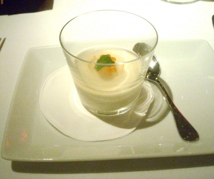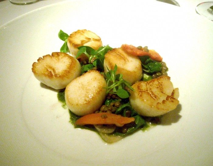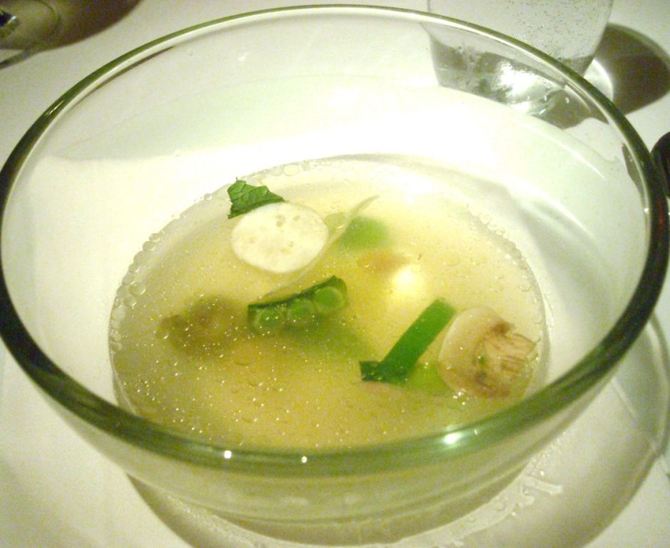 L’avverbio non è scritto a caso perché è evidente l’intenzione familiare, disimpegnata, della cena. Eppure lo chef John Fraser, che ha lavorato con Thomas Keller in California al French Laundry, che ha fatto un giro a Parigi fermandosi all’Arpège, che non più di tre anni fa è stato considerato il miglior chef emergente di New York, sembra non volersi accontentare del passo semplice e easy imposto dalla convenzione del sunday supper e inventa sprazzi di originalità con i fuori menu di raccordo. Come poco prima con l’amuse bouche, ora serve in tavola una boule trasparente: sul fondo ha adagiato tre piselli ancorati al proprio baccello, una lamina di champignon, un velo di cetriolo e qualche fogliolina di menta. Natalie versa un consommé vegetale direttamente nella boule e si sprigiona un profumo fresco, vitale, intenso e corroborante, in un piatto minimalista carico di suggestioni e profumi bucolici: basta poco per trovare un posticino nei cassetti della memoria.