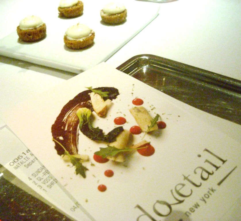 Se però a proporre il supper è, come spesso accade, un ristorante importante, con tutte le stelle al posto giusto, e se l’invito prevede un menu con piatti presenti in carta proposto a prezzo invitante (a volte con qualche maggiorazione, ecchesarà mai), la tentazione di provare è forte, perché pensi che la mano è la mano, l’idea è l’idea, e si dovrebbe acchiappare, indipendentemente dagli ingredienti, dal target e dal portafogli. E l’idea e la mano del Dovetail mi avevano incuriosito, per l’impiattamento variopinto, per un convinto e creativo uso delle verdure e degli ortaggi (secondo prassi provenienti dai vari Greenmarket di Manhattan), per i divertiti vocaboli culinari di tradizione europea in particolare italiana, per quella storpiatura da gangsta rapper del supper in suppa, per quell’aria, massì, un po’ di tendenza, immagine contemporanea della città, lontana da referenze turistiche.