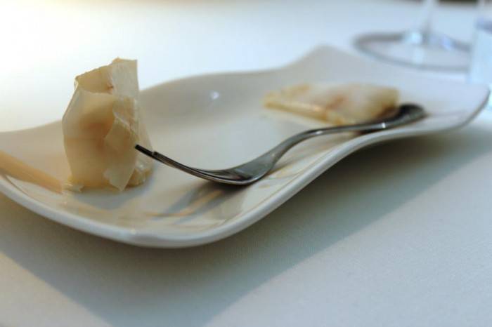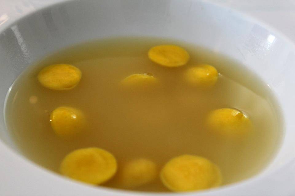 Giocato su equilibri e sfumature molto sottili, la dolcezza dell’estratto di cipolle, la sapidità dei bottoncini di Parmigiano Reggiamo, i pistilli di zafferano allungano il piatto conferendogli un carattere molto deciso.
