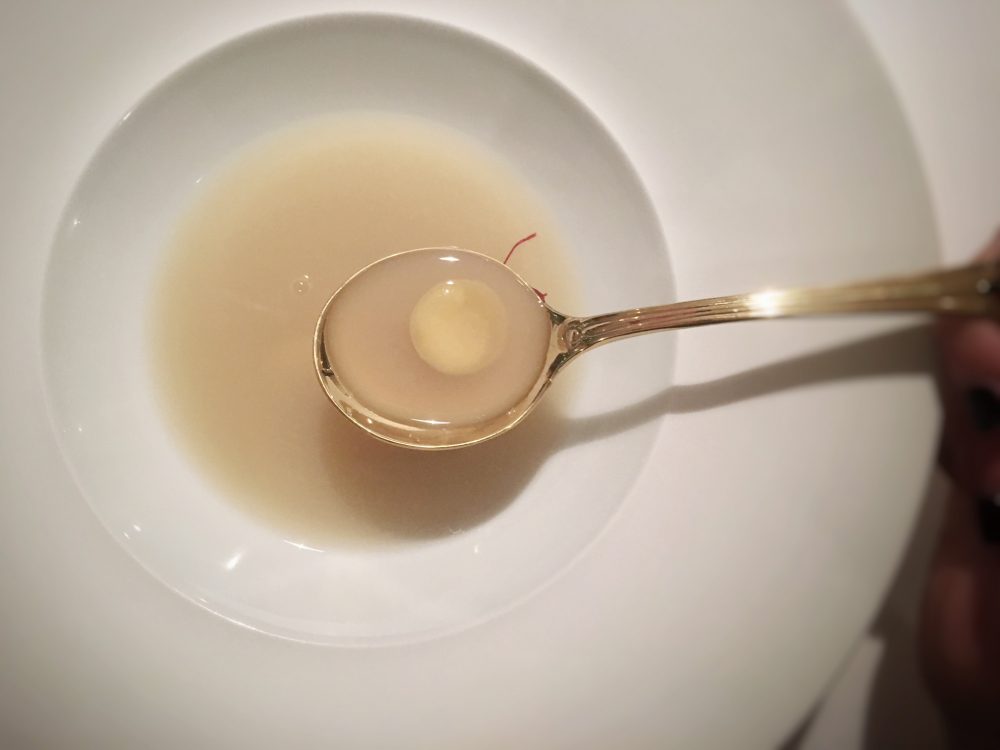 Il petto d’anatra viene servito su un patè e accompagnato da un’acqua affumicata e spinaci e mandorle. Dell’anatra lavora tutto lo chef; per il patè usa le interiora e le cosce; l’acqua è ottenuta con la carcassa arrostita ai carboni ed è piacevole il sentore di tostatura e di affumicatura che contamina l’acqua. L’ingrediente fondamentale di questo piatto paradossalmente è proprio l’acqua. Una volta cotta, l’anatra viene buttata in un bagno di acqua ghiacciata che la raffredda immediatamente con uno choc esterno. Le anatre tradizionali hanno la pelle croccante, qui con il lavoro sul ghiaccio e sulla cottura la pelle diventa un tutt’uno con il petto ed è il morso a diventare croccante, definito. Un piatto espresso: fatto, raffreddato, porzionato. Uno spettacolo.