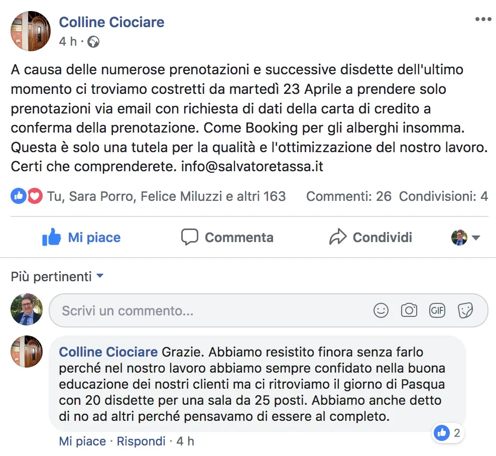 Tassa no show 20/4/2019 Torna a: No Show, Salvatore Tassa dice basta: d’ora in poi prenotazione solo con carte di credito come gli alberghi Il Post di Tassa