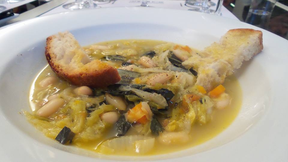 Come è nella tradizione di queste serate, ispirate dalla ricerca di abbinamenti gastronomici il più possibile in sintonia con i protagonisti enoici, il menu degustazione ha previsto due piatti classici della cucina toscana, la “ribollita” (minestra di verdure accompagnata da pane croccante), e l’arista di maiale alle castagne cotta al forno, guarnita, però, dai napoletanissimi friarielli; in chiusura abbiamo apprezzato un tortino di mele annurche con crema chantilly.