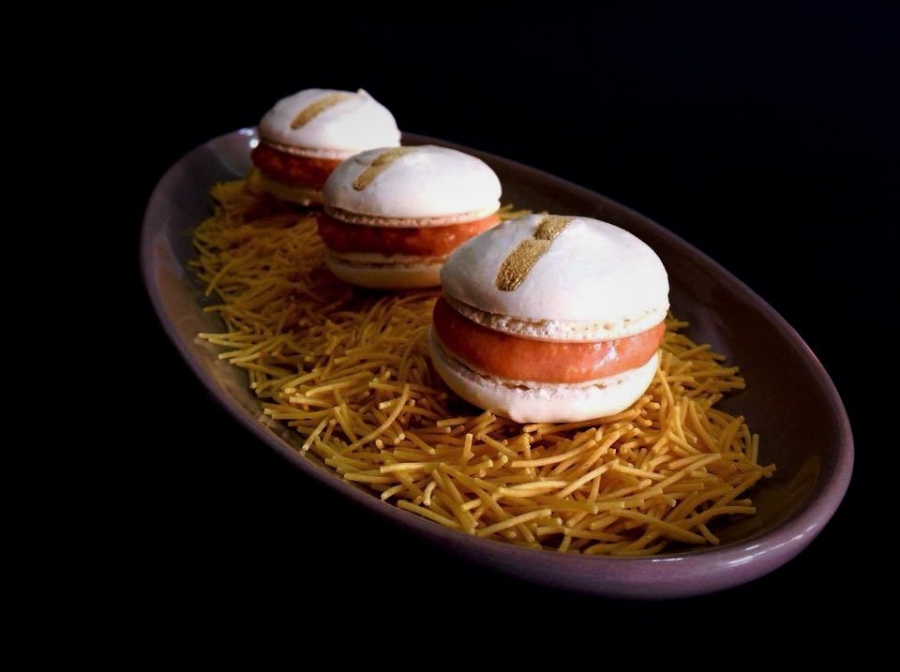 Macaron di pasta all’uovo con gelato di pomodoro e geleè di parmigiano al basilico pasta secca all’uovo (è necessario che sia secca e che sia un’ottima pasta), ridotta in polvere con il macinagraniglie, aggiunta poi ad una base di albumi e sciroppo di zucchero mediamente dolce, mitigato dal sale e dal sapore stesso della farina di pasta, il risultato sarà identico ad un macaron classico, croccante all’esterno e cremoso all’interno.