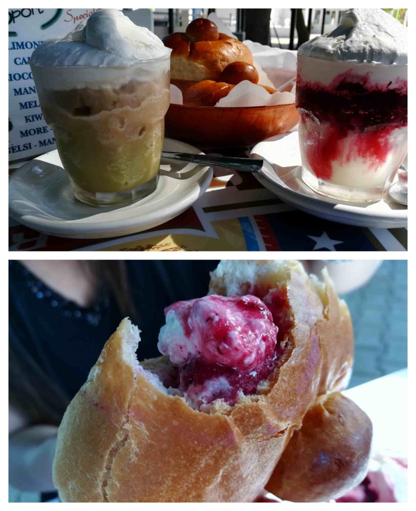 Il secondo giorno ci dirigiamo verso la bella e ultra-turistica Cefalù facendo però prima una sosta, dietro consiglio de “il Principe” che ci ha accolti presso Villa Rica (dove si gode di una meravigliosa vista sulle Eolie), a Gioiosa Marea dove al BAR SPORT – BRACCO si mangia una delle migliori granite siciliane. Quindi riempiamo prima e inzuppiamo poi le nostre morbidissime brioche nelle squisite granite al Pistacchio&Nocciola e Gelsi&Mandorle con un immancabile top di panna.