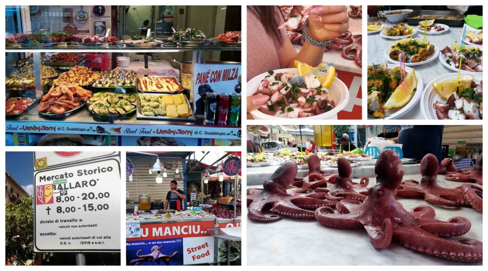 La prima ed insostituibile tappa a Palermo non può che essere fatta allo storico mercato di Ballarò. Il fascino di questo luogo è incredibile e si arriva ad invidiare i Palermitani che possono raggiungerlo ogni qual volta vogliano. Ci abbiamo perso ore e lo abbiamo girato in lungo ed in largo, stregati ed invogliati da ogni banco, per non parlare dello Street Food che più “street” non si può! Tanto ci incanta e ci diverte il venditore di polpi cotti, tagliati e serviti al momento, che non possiamo fare a meno di fare un brunch con un piattino di polpo condito con sale, olio, pepe e limone.