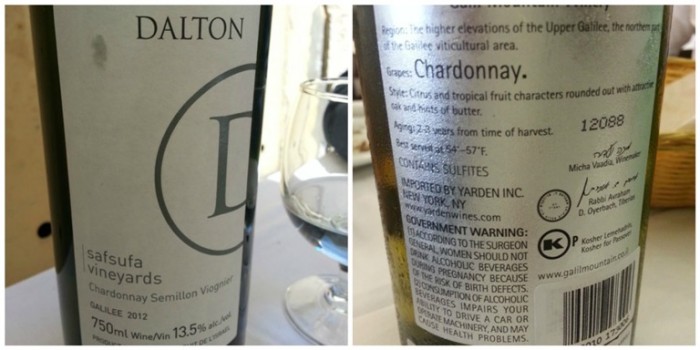 La cantina, oltre ad essere fornita di etichette italiane ha buoni Syrah e Chardonnay di Galilea. Io mi sono orientato su questi ultimi bevendone due di differenti case, entrambi molto profumati, freschi e con buona spalla. Il Dalton della zona di Safsufa (insediamento a nord della Galilea) e il Galil proveniente da insediamenti vicini. Entrambi di vigneti coltivati in alta collina dove le escussioni termiche tra giorno e notte sono particolarmente significative e contribuiscono particolarmente all’aromaticità delle uve.