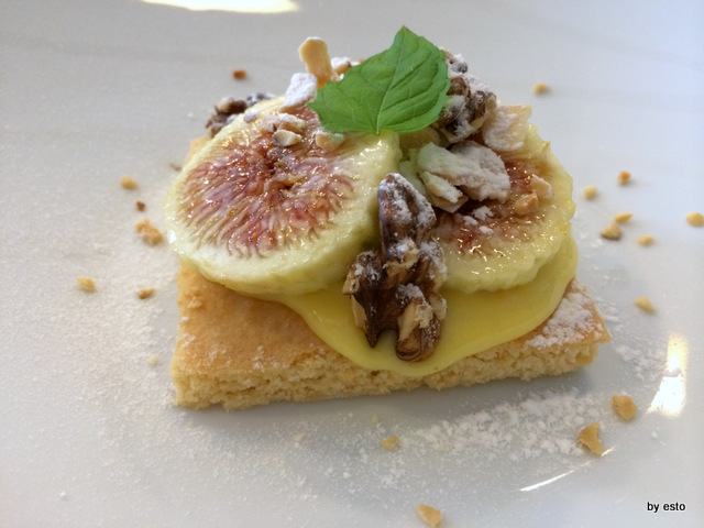 Cialda di frolla, crema all’amaretto, fichi e frutta secca