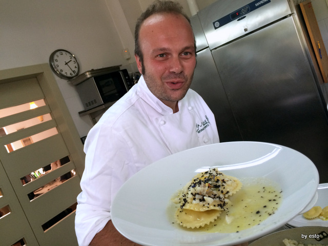 Ravioli di patate e provola, baccalà e polvere di olive nere