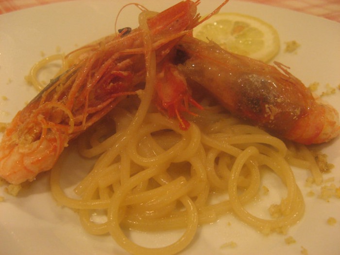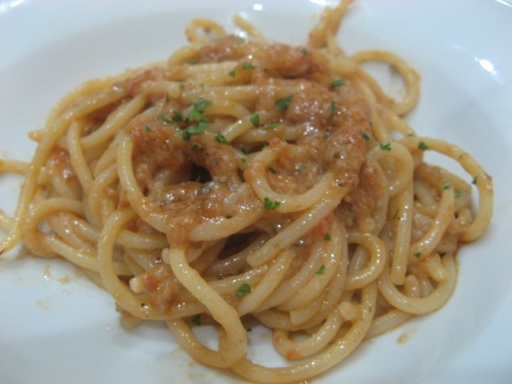 io voto per gli spaghetti con acciuga,pomodoro di pachino,gambero rosso di sicilia e mollica