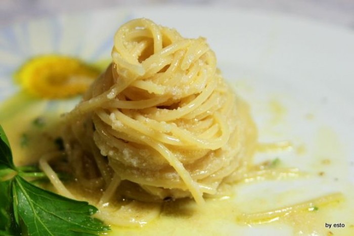 Spaghetti con uova di merluzzo, olio di oliva, limone e pepe