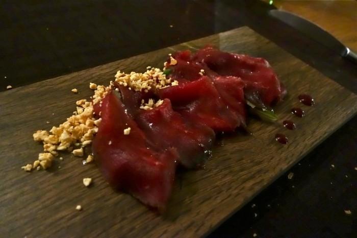 Moma, filetto di cervo marinato al finocchietto selvatico, ricotta infornata e riduzione di frutti rossi