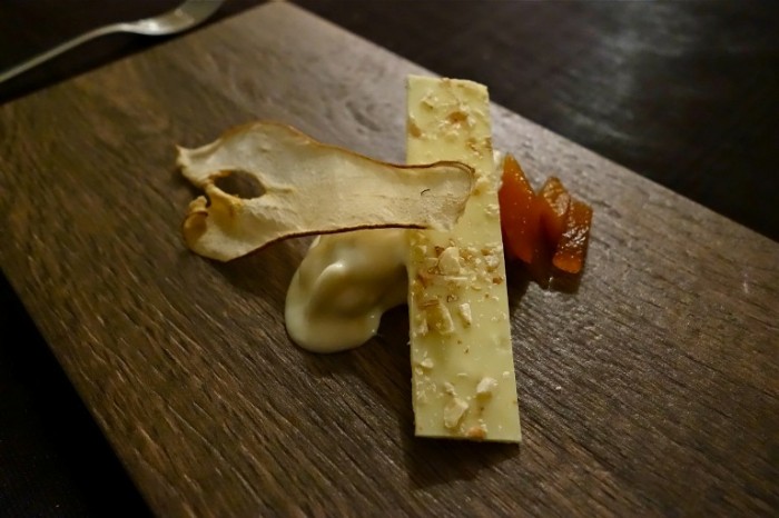 Gorgonzola cremificato selezione Luigi Guffanti, cioccolato bianco alle noci, pera disidratata e pera cotta nel vino (inserito come portata extra su nostra richiesta): abbinamento davvero azzardato il cioccolato bianco con il gorgonzola, una degna conclusione prima di passare ai dolci!
