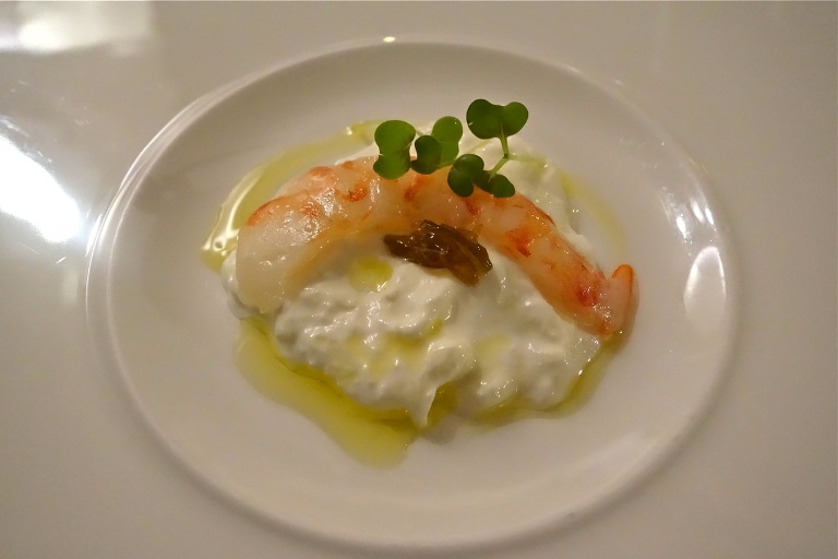 Amouse-bouche, gambero cotto a bassa temperatura con stracciatella di burrata, mosto dʼolio e bergamotto candito. Decisamente azzardato, decisamente riuscito.
