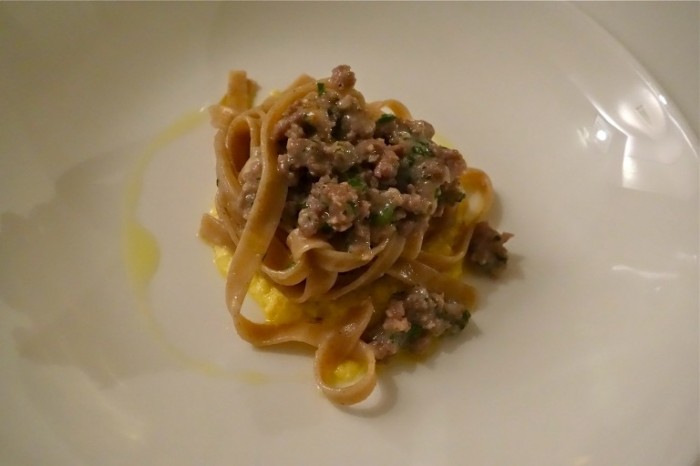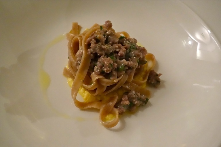 Fettuccine di farro al ragù di salsiccia di Bra alla carbonara: un piatto che sa di rustico, ma estremamente complesso nei suoi sapori decisi. La salsiccia è prepotente, rinforzata dallʼuovo e dagli aromi delle erbe. Colpisce più il cuore che la mente, come piace a noi!