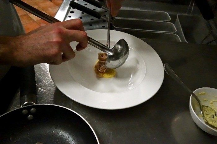 Chiediamo ad Annamaria di poter assistere alla preparazione di un piatto, ed è così che ci troviamo in cucina, con un Simone che si muove magistralmente tra i fornelli, pur