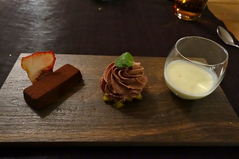 Selezione di cioccolati, cioccolato bianco da bere con lemongrass e scorze di lime, spuma di cioccolato al latte, ganascia al cioccolato fondente: veniamo guidati nella degustazione, che parte in modo strepitoso col cioccolato bianco, fresco e saporito, da berne a litri senza mai stancarsi. Gradevole più di consistenza che di sapore la spuma. Troppo impegnativa invece la ganascia.