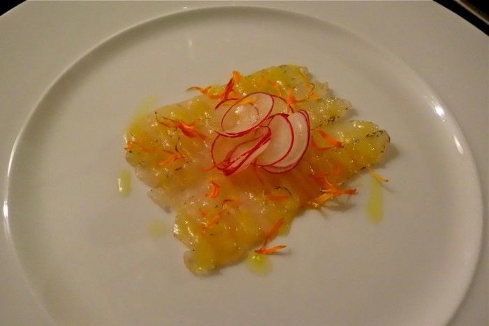 Carpaccio di storione allʼaneto e sciroppo alla calendula con insalatina di rapanelli: altro grande piatto, con il forte sapore dello storione e la sua particolare consistenza che vengono valorizzati rispettivamente dalla dolcezza dello sciroppo e dalla croccantezza del rapanello.
